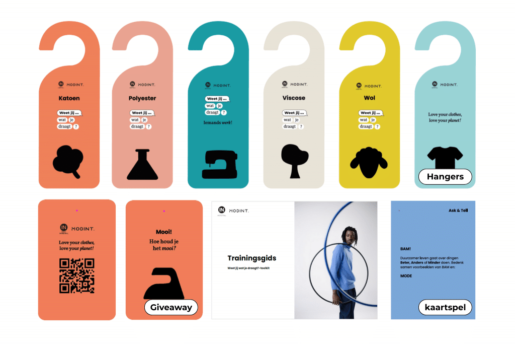 De Weet jij wat je draagt?-toolkit bevat fysieke tools en trainingsmateriaal om makkelijk met klanten in gesprek te gaan over duurzaamheid. De toolkit bevat hangers met opvallende teksten en QR-codes. Die prikkelen én nodigen uit tot een gesprek.